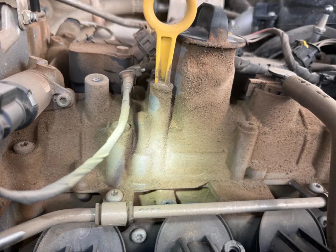 后来仔细检查了车况,发动机没有拆装和维修的痕迹,但是发动机上面尘土很多