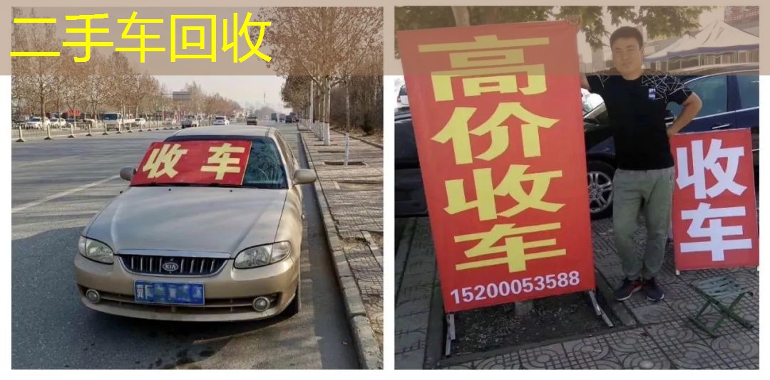 常年以来,他的办公标配有“一大两小共三件”:一间便捷可移动的办公室——去年收的一辆起亚千里马,一个二十来块钱的小马扎,还有一块儿写着两个醒目黄色大字“收车”的红牌子。